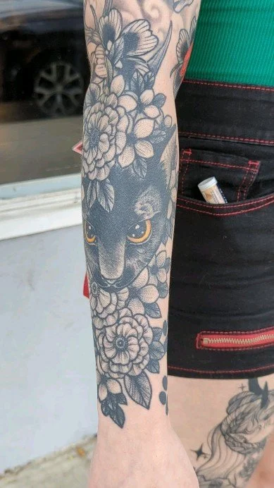 My interests in tattooing include Japanese, illustrative, biomechanical, and traditional with a strong focus on bold lines. I'm always down for something new and challenging. I also produce original artwork in several mediums.